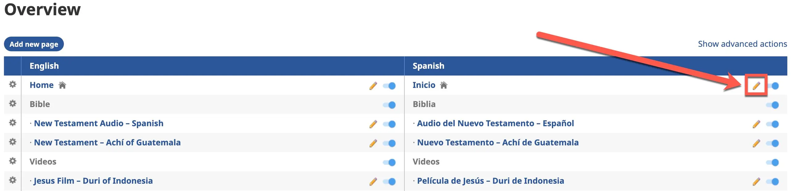 1. On the Overview chart, click on the pencil icon for the page you want to translate in the language column that needs the translation.