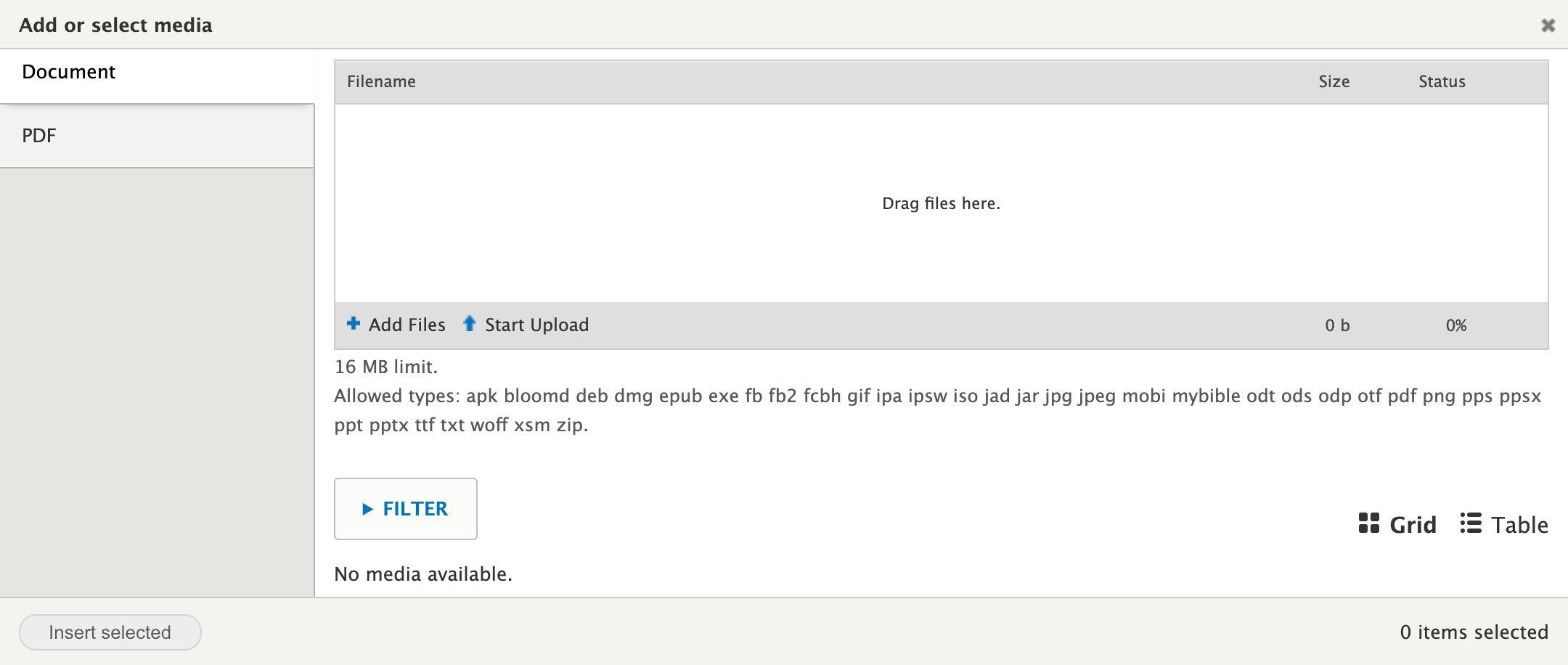 c) If you have already uploaded relevant document files to your website, they will appear in the lower section of the working box.