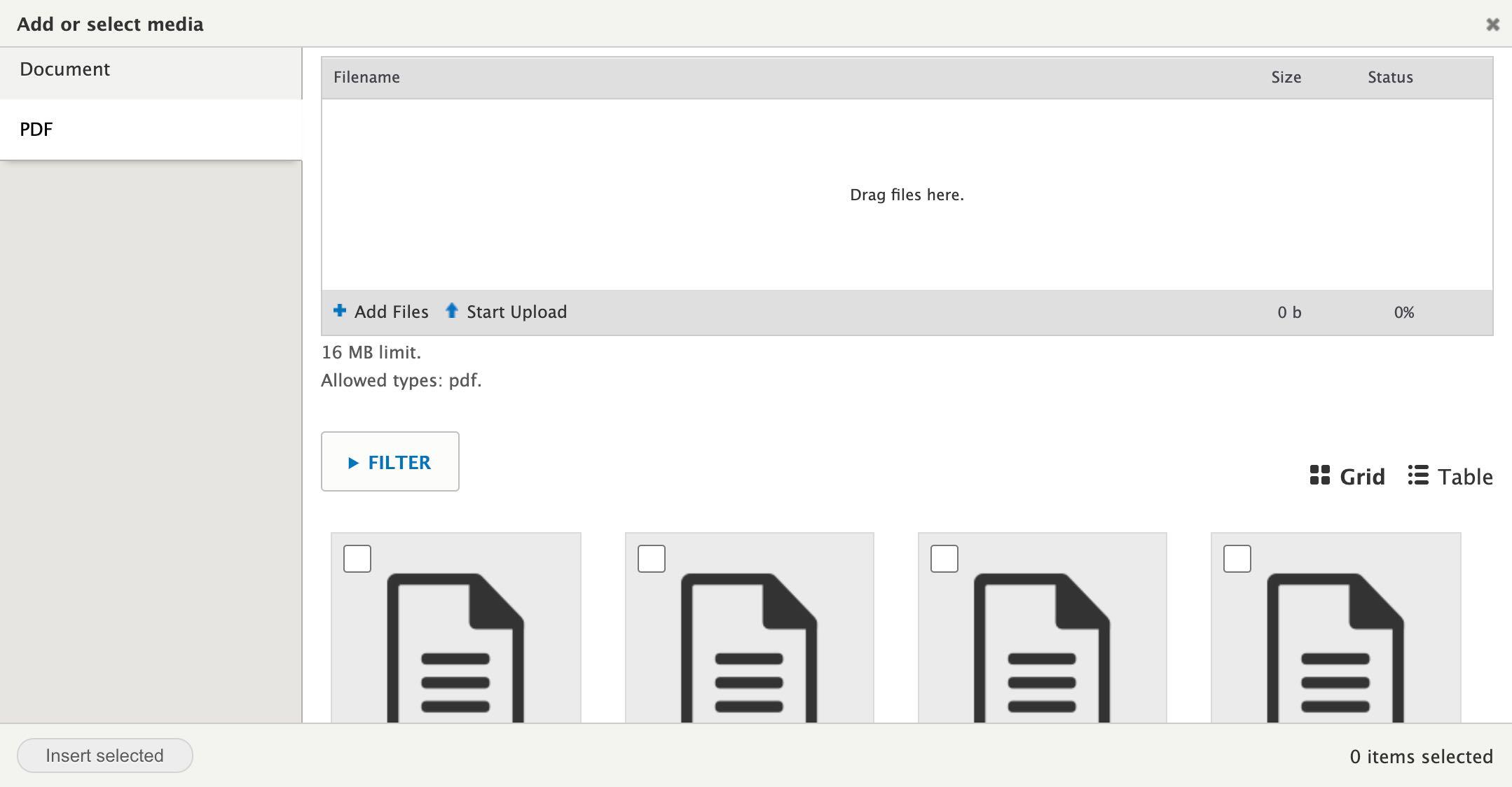 f) If you have already uploaded PDF files to your website, they will appear in the lower section of the working box.