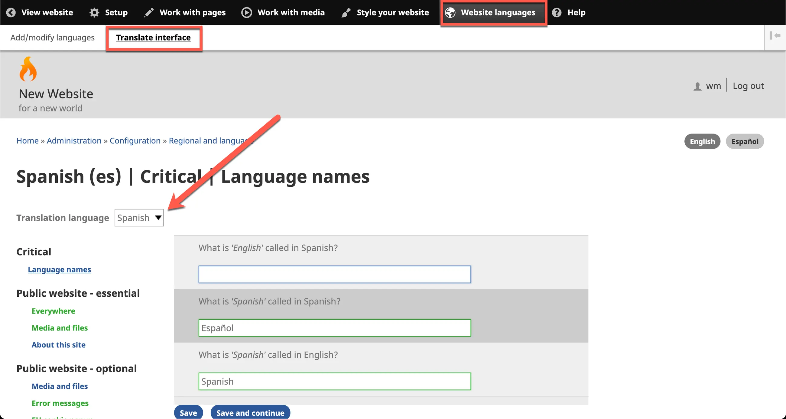 2. If one of your Navigation Languages is a “language of wider use” (trade language) that will be used on several websites, a single set of interface translations may be completed, then shared among websites. Ask your Digital Publishing Manager or workshop facilitator for help.