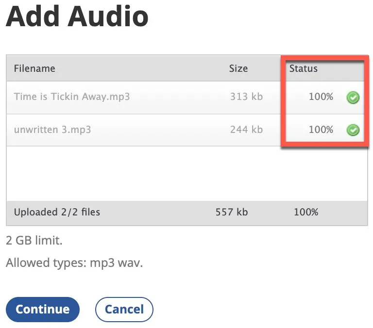 g) Files will have a green dot with a checkmark once they are uploaded successfully, and the Status will be 100%.