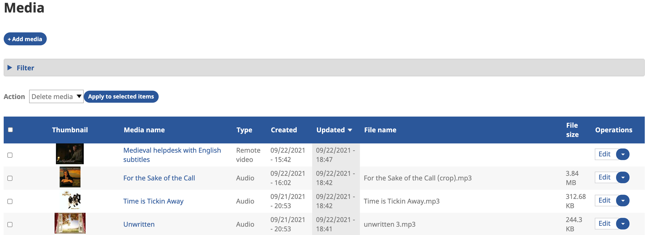 (Note that when you hover over sub-menu item Add media, a drop-down list appears of six specific media categories. These are the same options as those on the Add media screen. You may click on an option on the drop-down list as a short-cut to upload that media category.)