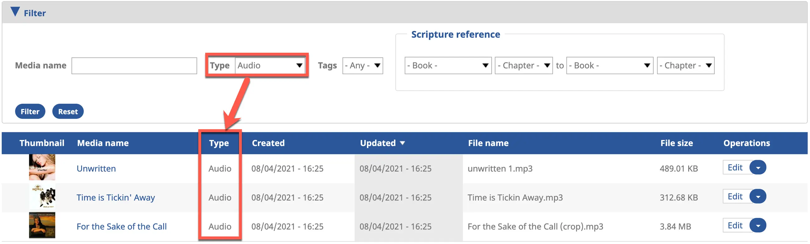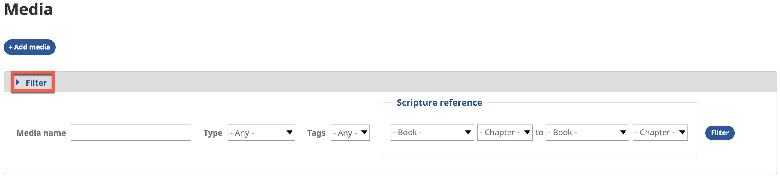 a) Enter any combination of media name, type (category), tags, and Scripture reference, then click on the Filter button.
