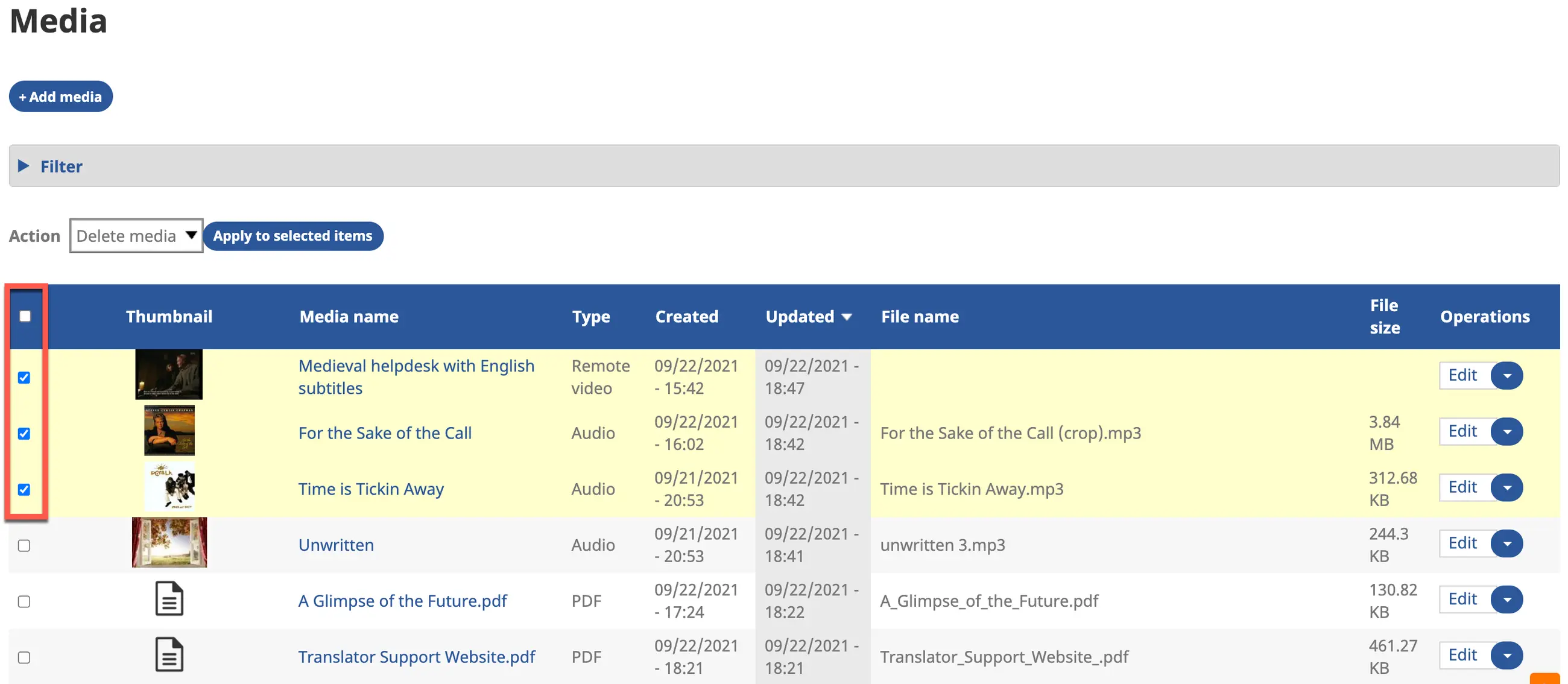 a) Use the check boxes at the left side of the Media Library chart to select items.