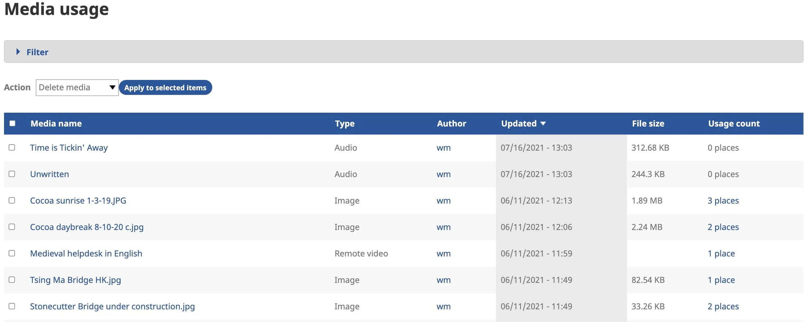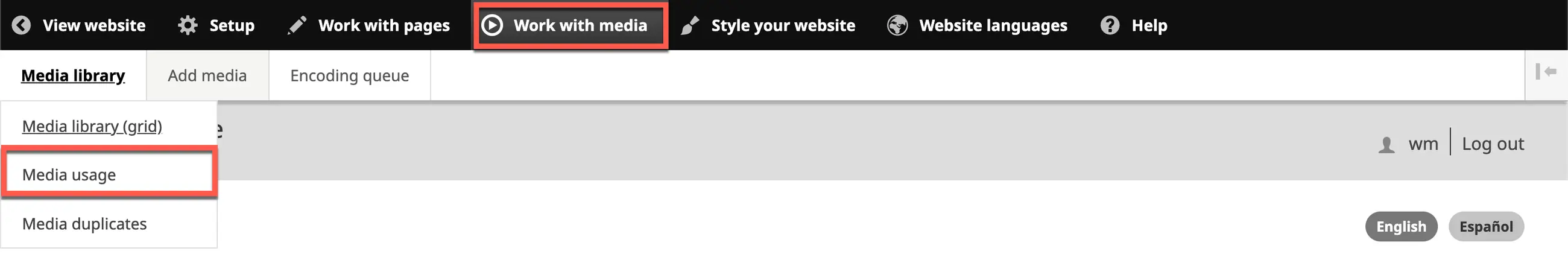 1. On the Wildfire menu, click on Work with Media, hover over Media library, then click on Media usage.