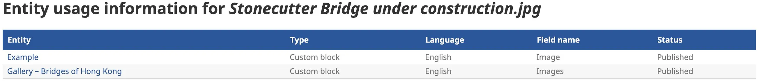d) The column Entity on the left lists the page(s) where the item is used.