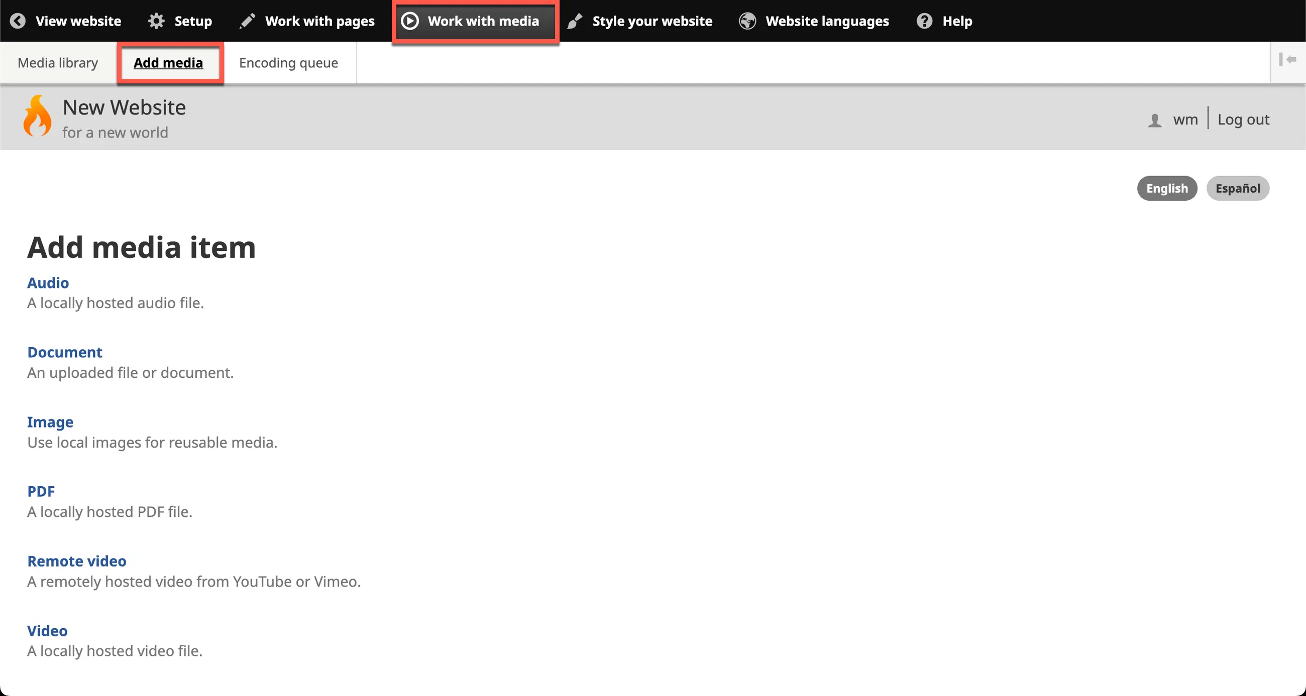 3. The Add media item screen appears, with a list of six categories of media you may upload.