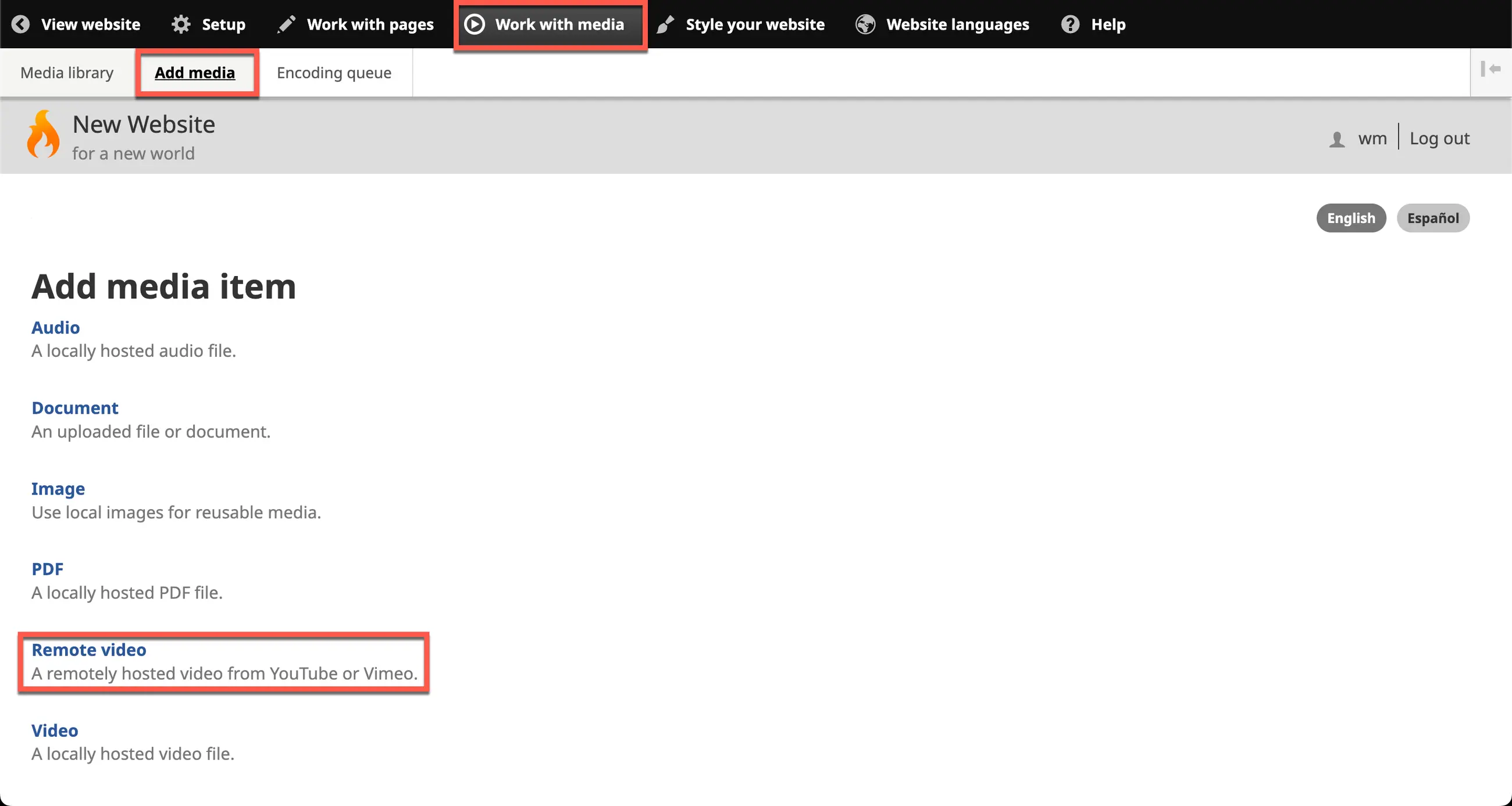 4. On the Wildfire menu, click on Work with Media, then click or hover on Add media, then select Remote video.