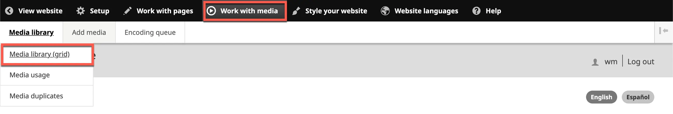 1. On the Wildfire menu, click on Work with Media, hover over Media library, then click on Media library (grid).