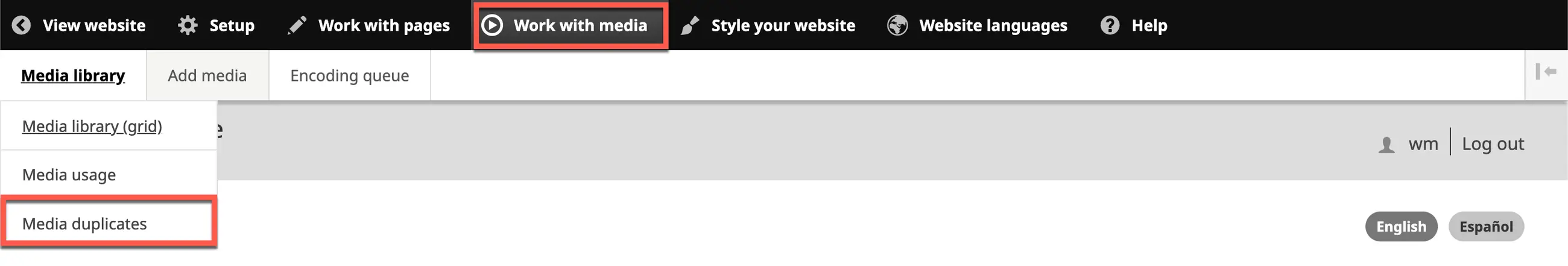 1. On the Wildfire menu, click on Work with Media, hover over Media library, then click on Media duplicates.