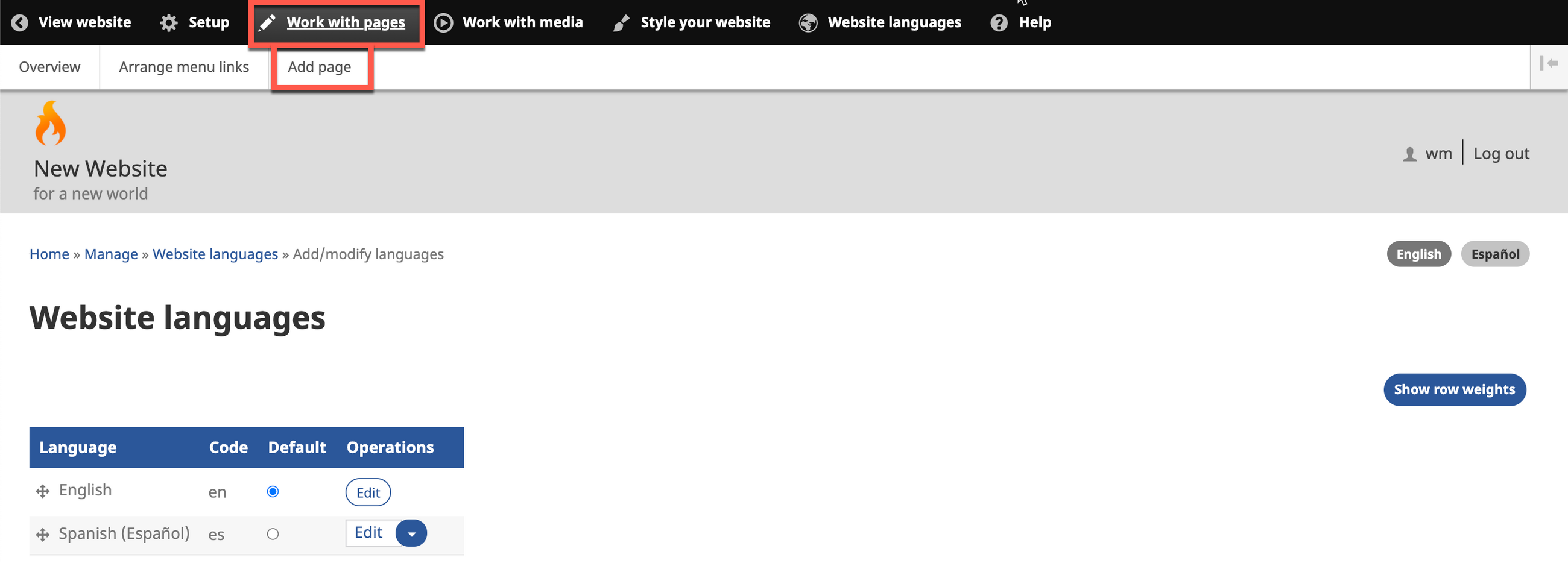 4. If you are elsewhere in the Wildfire system and you wish to add a new page, click on Work with pages in the top row of the Wildfire menu, then click on Add page from the sub-menu.