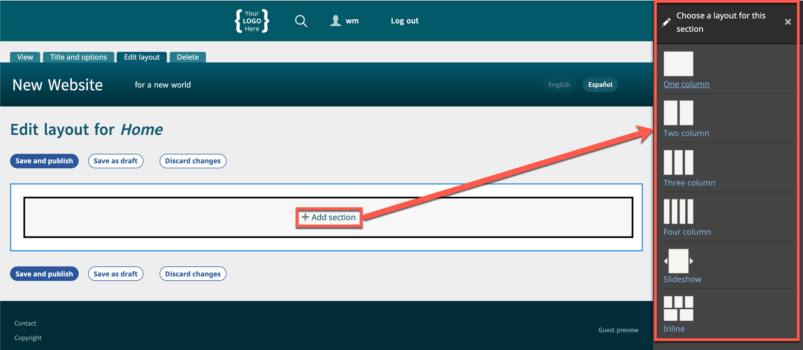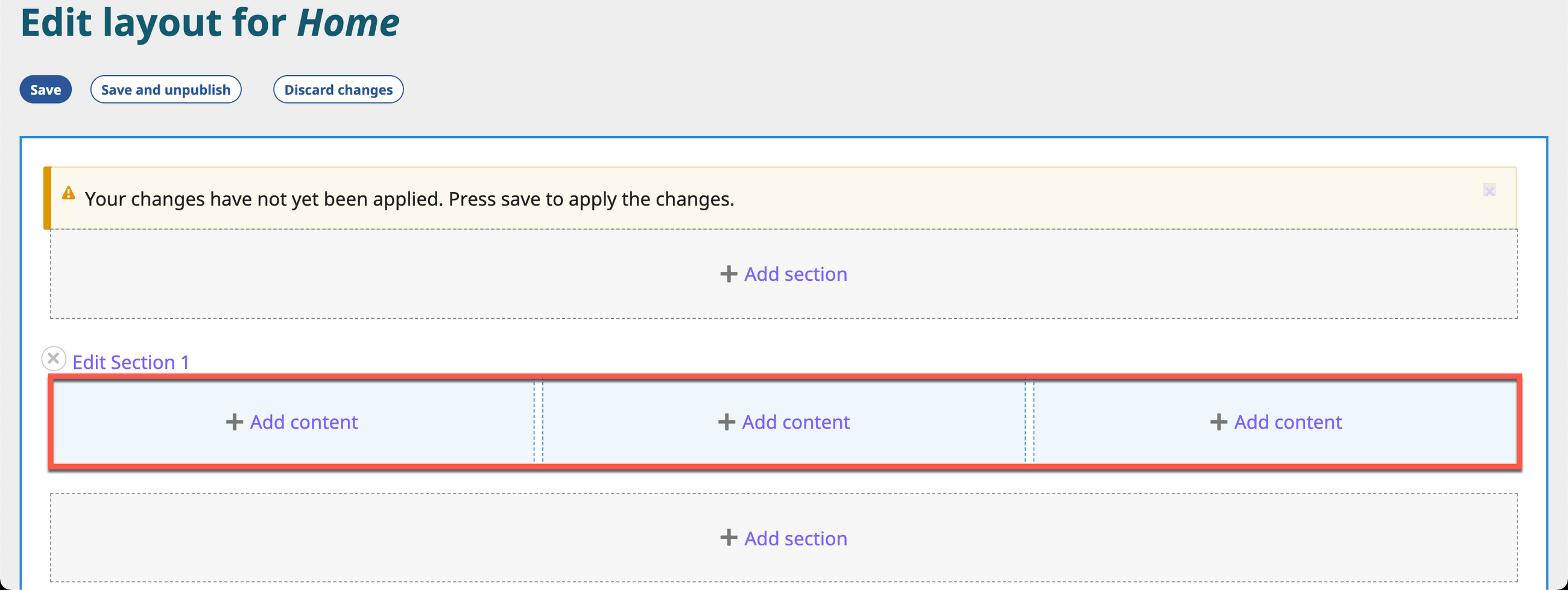 4. The main layout display changes to reflect the layout style selected for that section. A new Content block is shown in each part of the section.