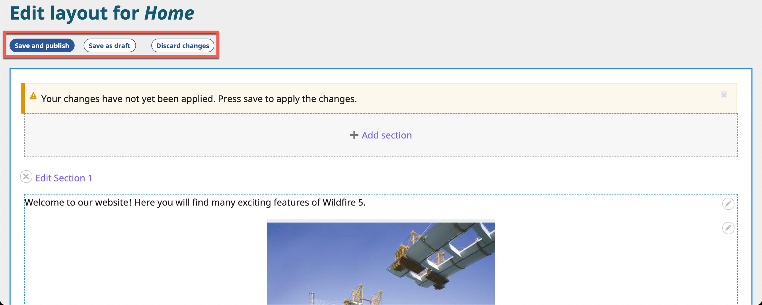 The background color of the page sections will be different from the theme colors, as a visual reminder that this is an unpublished page.