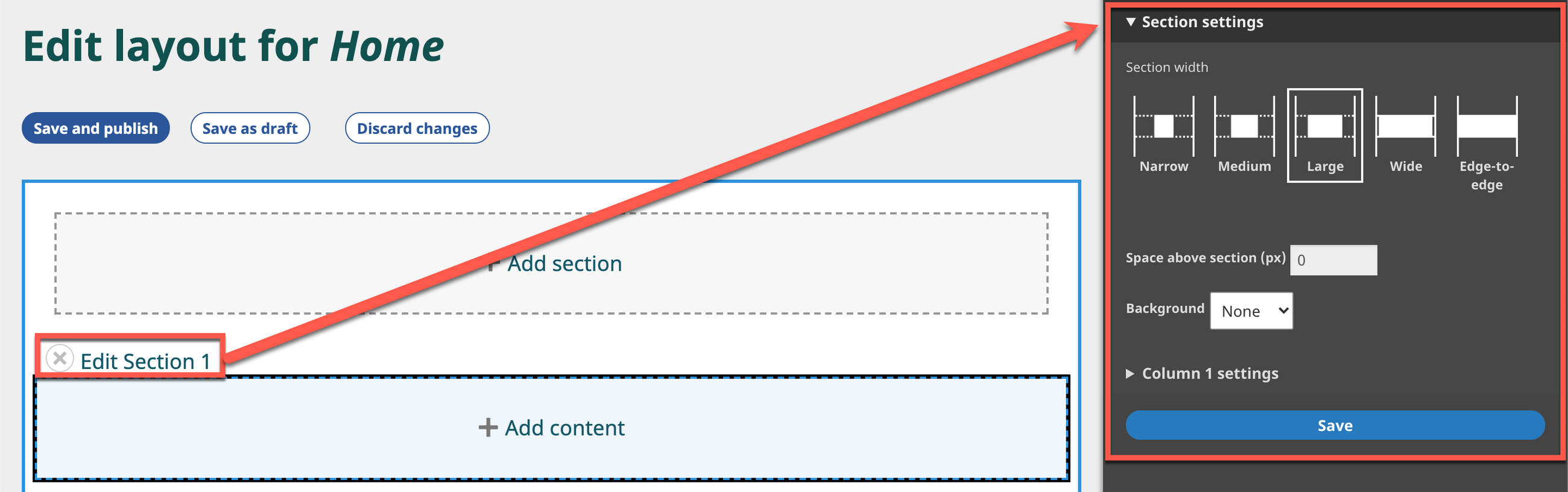 e) For multicolumn sections, you may select different background colors for each column, and you may specify the relative width of each column in percentages.