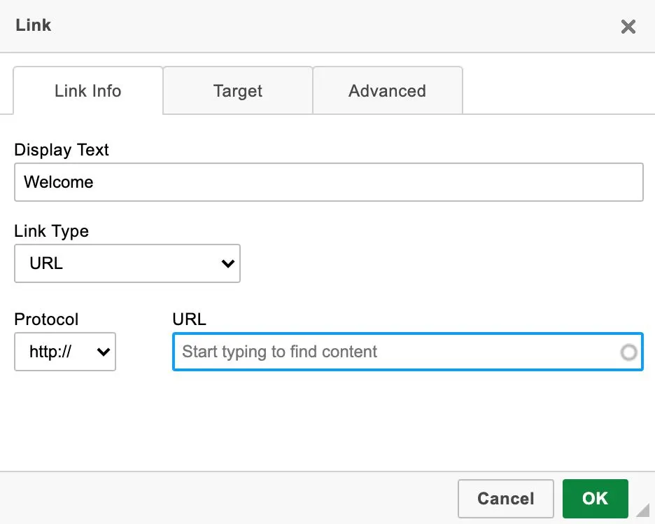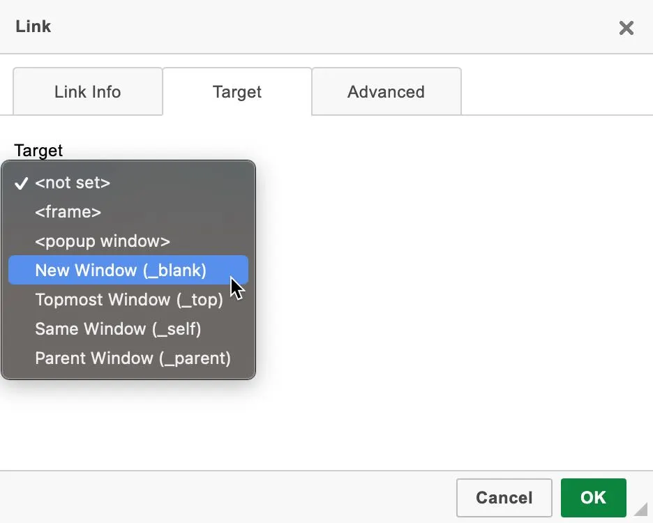 7. If you are creating a link to an external website, click on the tab Target to specify where the link opens.