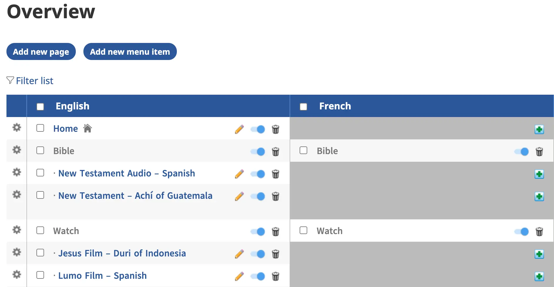 2. If you added a new Navigation Language to the website, the Overview chart will have a column for that language without page titles.