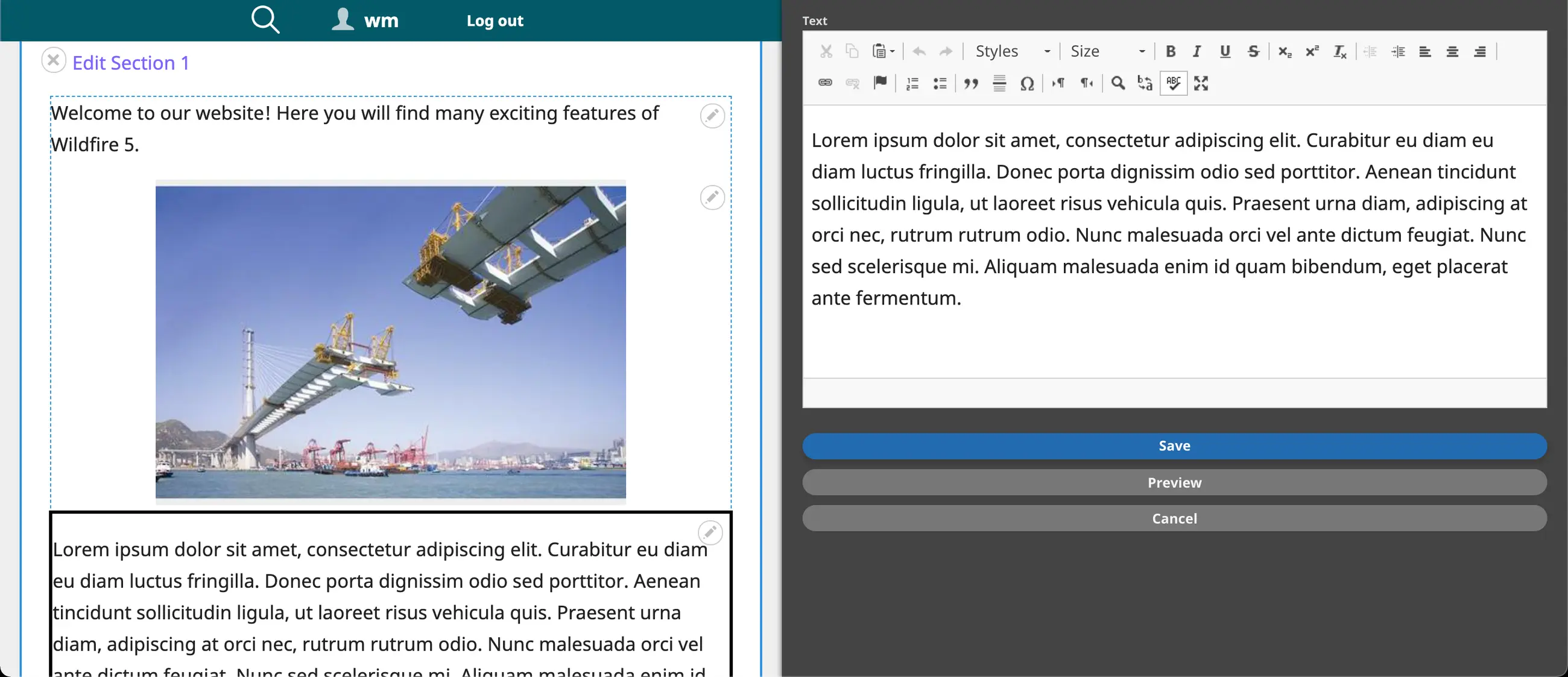 In our example, we are editing a text block, so the text editor sidebar appears.