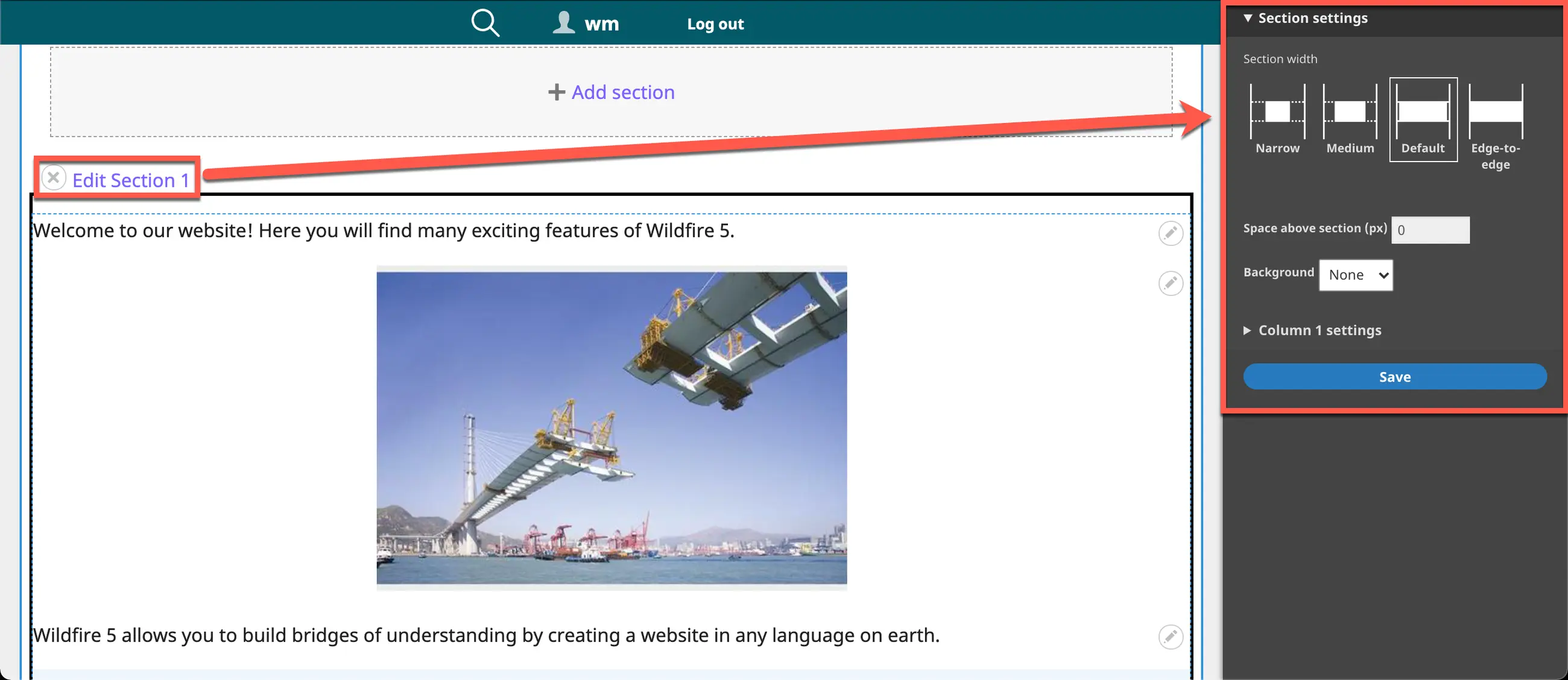 d) You may specify Space above section in pixels. This adds separation on the page from the section above (if there is one).
